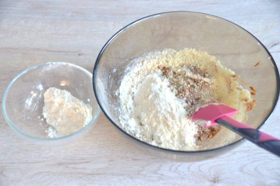 Затем небольшими порциями введите пшеничную муку с разрыхлителем, смешайте.