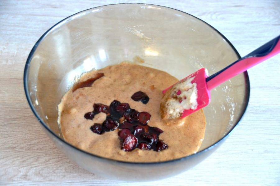В последнюю очередь выложите вяленую вишню с остатками ликера, смешайте.