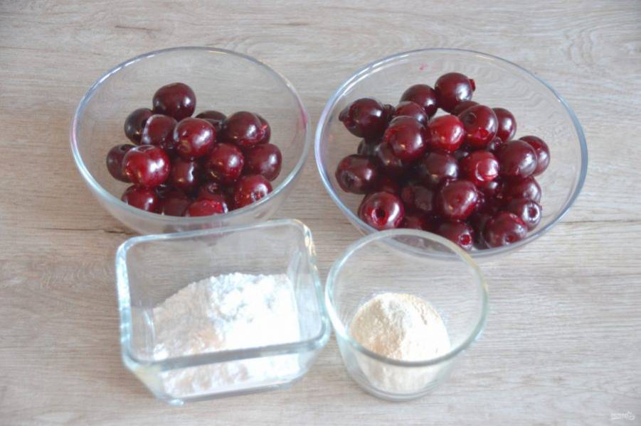 Для приготовления вишневого компоте приготовьте вишню без косточек, сахарную пудру, пектин и по желанию щепотку корицы.