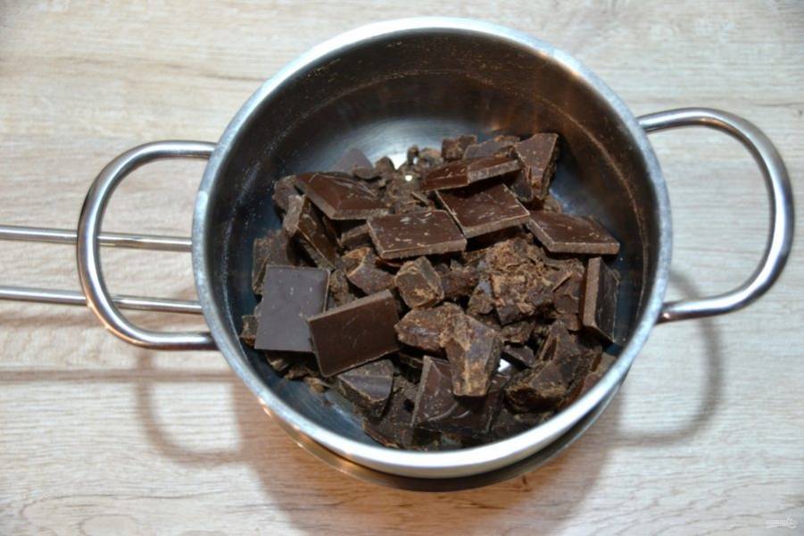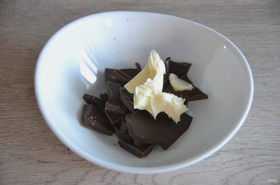 На водяной бане или в микроволновой печи растопите шоколад со сливочным маслом.
