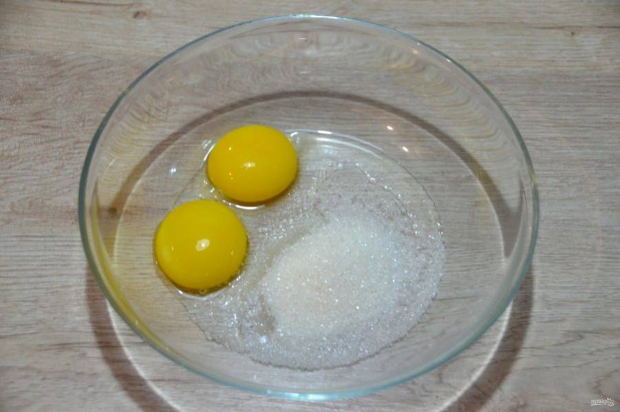 Разделите 2 яйца на белки и желтки, к белкам добавьте щепотку соли, к желткам всыпьте сахар. Желтки разотрите с сахаром и ванильным сахаром добела.