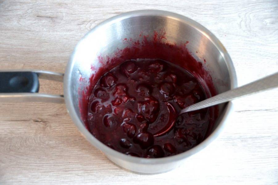 100 грамм вишни без косточек выложите в сотейник, нагрейте и разомните в пюре. Всыпьте в сотейник к вишневому пюре еще 200 грамм вишни без косточек. По желанию добавьте щепотку корицы.