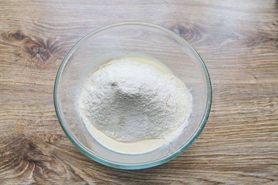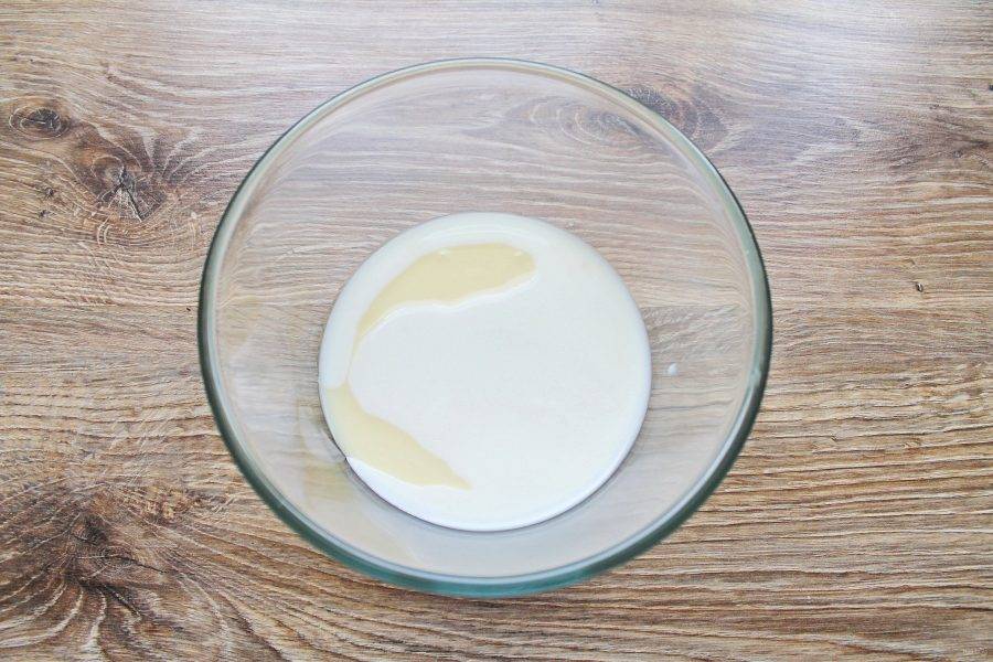 В миску выложите сгущенное молоко и влейте молоко, перемешайте до однородности.