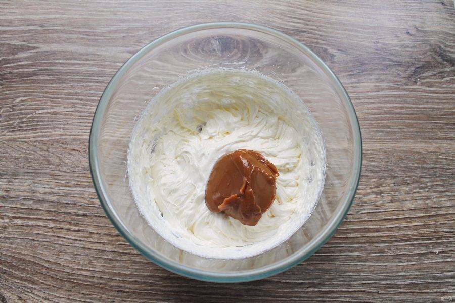 Прибавьте скорость, продолжая взбивать, добавляйте по столовой ложки вареное сгущенное молоко.