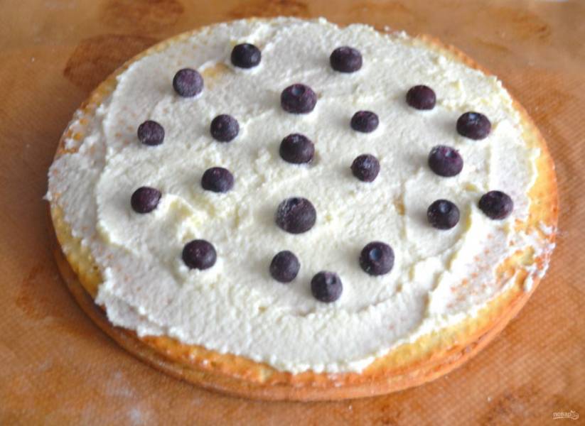Следующий корж смажьте белым кремом, можно добавить любые ягоды или кусочки фруктов. В данном рецепте использована замороженная черника.