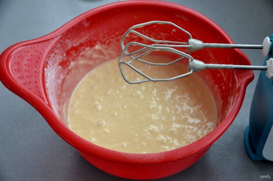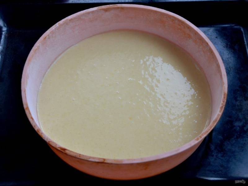 Коржи для этого торта выпекаются отдельно. Вылейте в форму для запекания одну треть теста, хорошо встряхните для выравнивания, выпекайте в духовке при температуре 180 градусов 15 минут. Если не уверены в своей форме, то смажьте ее сливочным маслом и присыпьте слегка мукой, так корж без труда будет извлечен из формы.