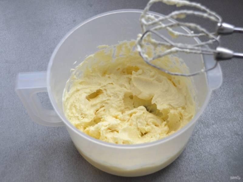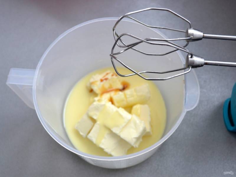 Взбейте размягченное сливочное масло со сгущенным молоком с добавлением экстракта ванили. Взбивайте на небольшой скорости, чтобы крем не перебить.