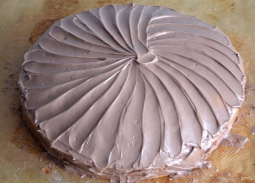 Когда коржи полностью остынут, начните сборку торта, смажьте нижний слой шоколадным кремом.