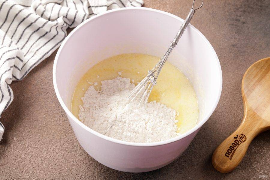 Частями введите муку, предварительно отложив отдельно 3 ст.л., они нам понадобятся чуть позже.