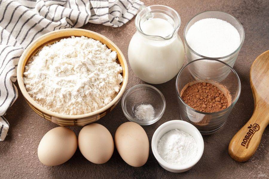 Подготовьте продукты. Кефир возьмите жирностью 2,5%, можно больше. Яйца — категории С1. Какао-порошок берите натуральный, напиток "Несквик" не подойдет. Все продукты должны быть комнатной температуры, поэтому достаньте кефир и яйца из холодильника заранее.