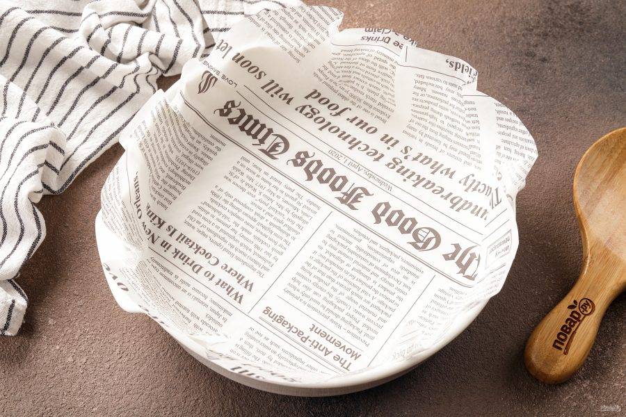Возьмите форму для выпечки, моя диаметром 20 см. У меня форма с невысокими бортиками и я застелила её силиконизированным пергаментом, формируя борта. Если у вас обычная бумага для выпечки или форма с достаточно высокими бортиками, то просто смажьте дно и бока растительным маслом.