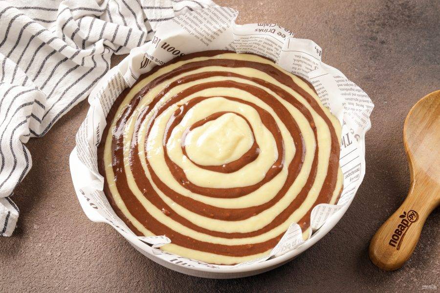 Необходимо помнить, что все порции теста должны быть приблизительно одного объёма. Если брать по одной столовой ложке — полоски будут тонкие. Если по 2-3, то линии в конечном варианте станут более контрастными и чёткими. Процесс напоминает образование кругов на воде. Только вместо камня мы бросаем в середину ёмкости тесто, чередуя его цвета. Используем всё тесто, чередуя его так между собой.