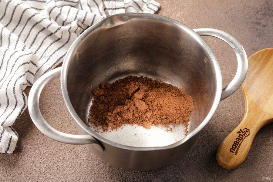 В небольшой кастрюльке или сотейнике соедините сахар и какао.