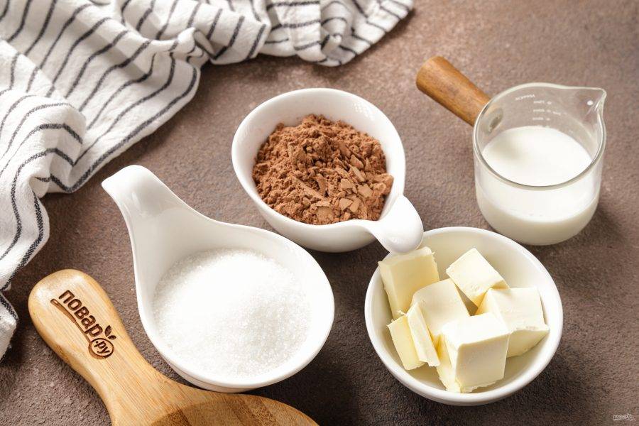 В таком виде выпечку уже можно подать к чаю, но я предлагаю приготовить шоколадную глазурь. Вкус будет намного ярче! Чтобы упростить работу можно использовать плитку тёмного шоколада. Разломайте её на части, добавьте 4 ст.л. молока и 1 ст.л. сливочного масла. Перемешайте и импульсами подогрейте в микроволновке до жидкого состояния. Затем поместите в холодильник на 20 минут. Я буду готовить глазурь, используя какао. Понадобится сахар, какао, молоко и кусочек сливочного масла.