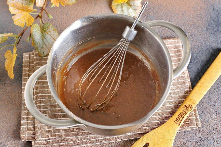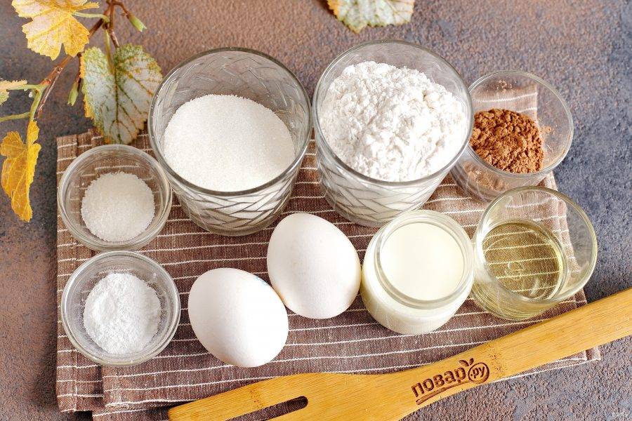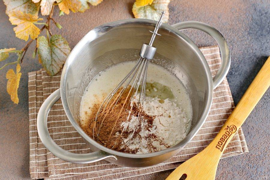Перемешайте. Добавьте 2 ст.л. муки, 1 ст.л. какао, 1 ст.л. растительного масла и 1/2 ч.л. разрыхлителя.