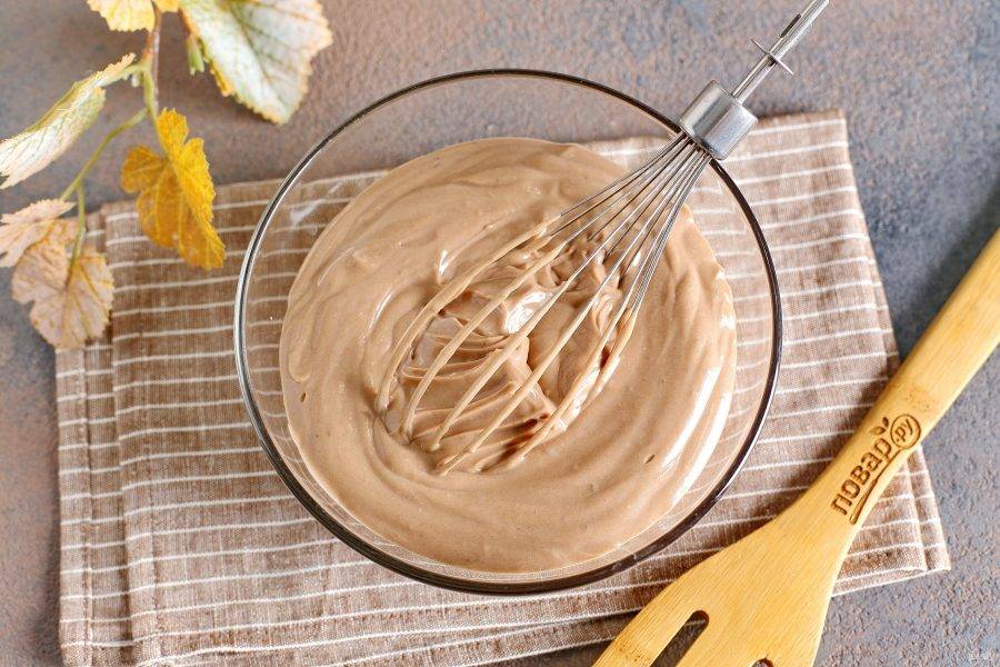 Я приготовила вот такой крем: сметана - 200 гр., творожный сыр в пачке - 150 гр., сахар - 100 гр. и плитка темного шоколада - 100 гр. Взбейте сметану с сахаром. Добавьте творожный сыр и снова все взбейте. Затем добавьте растопленный шоколад и взбейте все еще раз. Крем готов.