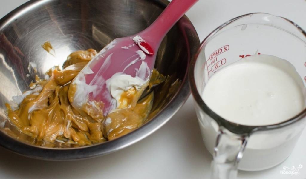 Смешайте сметану и варёную сгущёнку.
