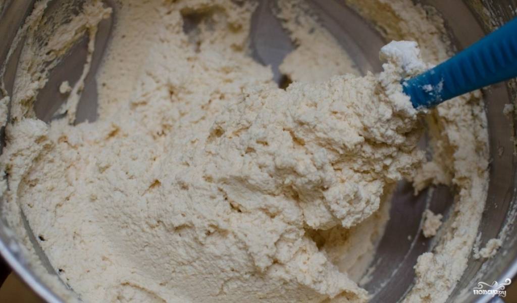 Добавьте к тесту муку. Добавляйте её по чуть-чуть, постоянно замешивая тесто.