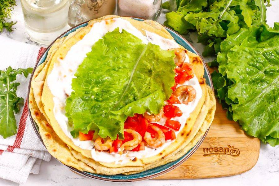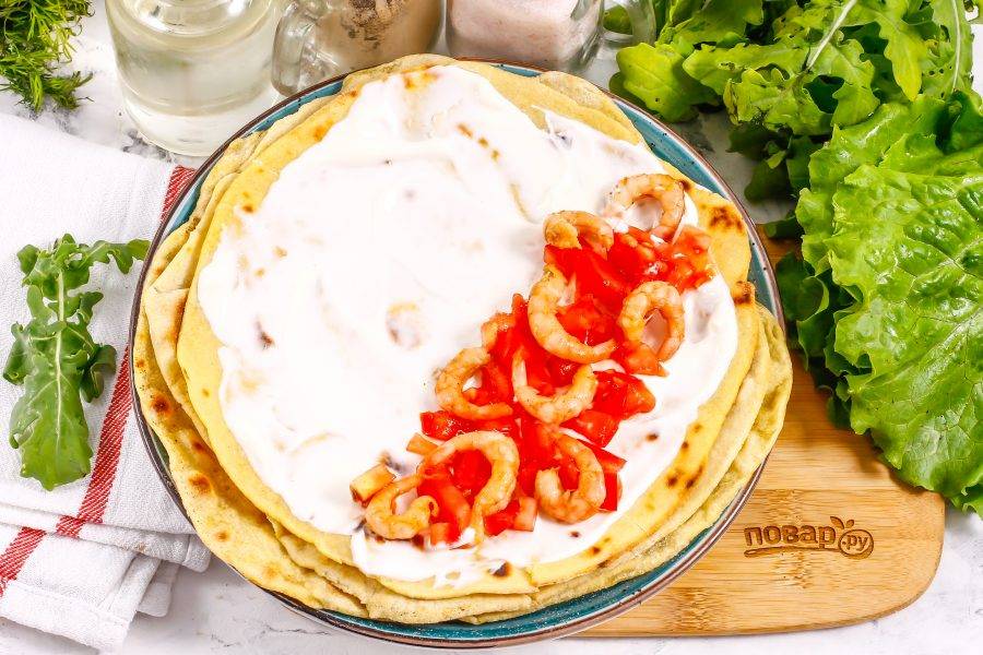 Выложите слой томатной нарезки на половину тортильи, на помидоры — креветки.