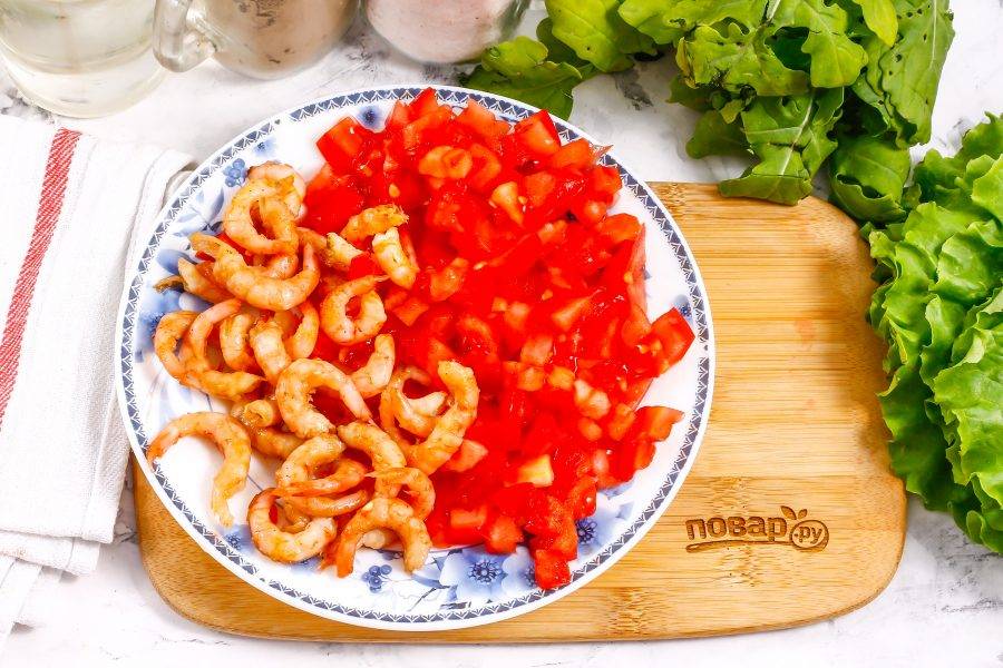 Очистите остывшие креветки от панцирей. Помидор промойте в воде, вырежьте зеленую сердцевинку и нарежьте томат мелкими кубиками.