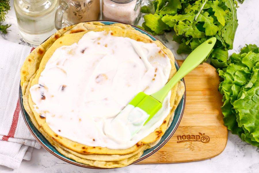 Каждую тортилью обмажьте сливочным или плавленым сыром по диаметру.