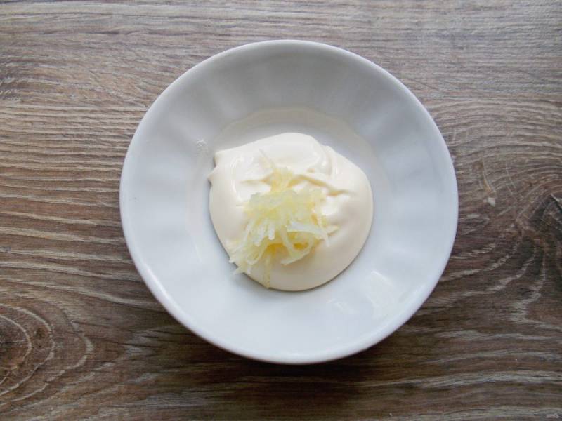 Чеснок очистите, натрите на мелкой терке, добавьте в майонез и перемешайте.