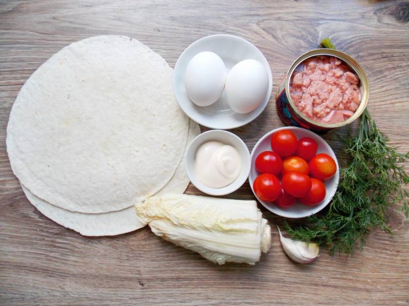 Подготовьте все необходимые ингредиенты для приготовления тортильи. Яйца вымойте и остудите. Тунец откройте и тщательно слейте жидкость.