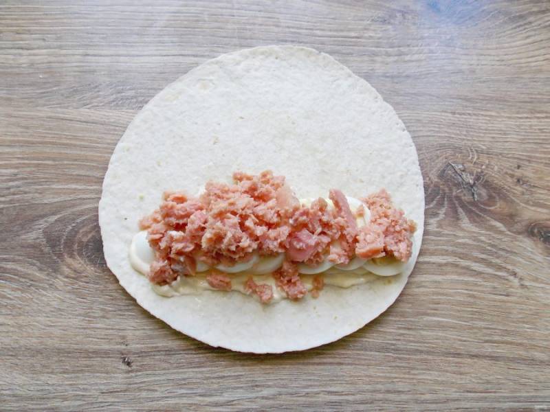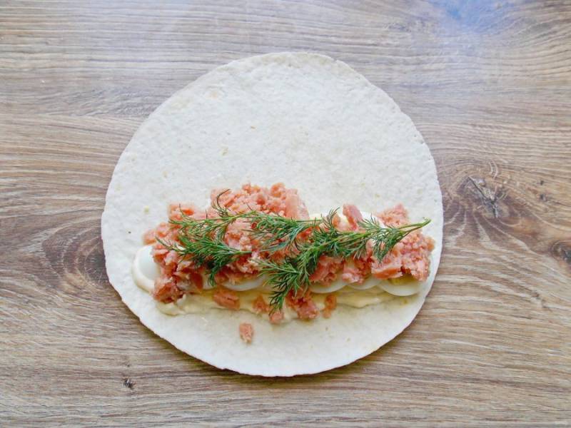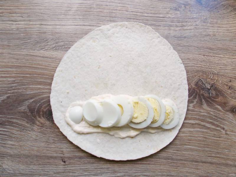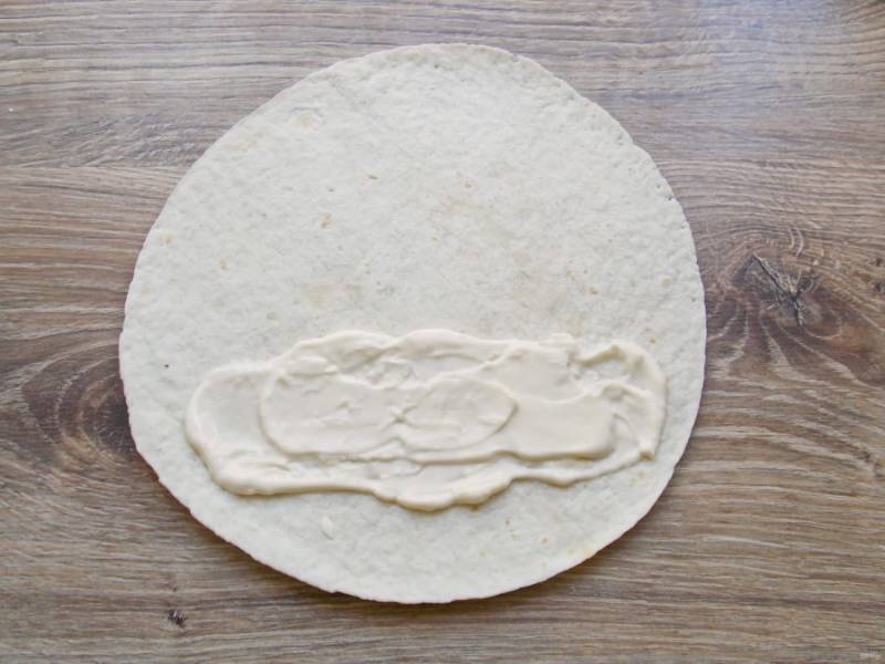 Выложите тортильи, намажьте на один край майонез с чесноком.