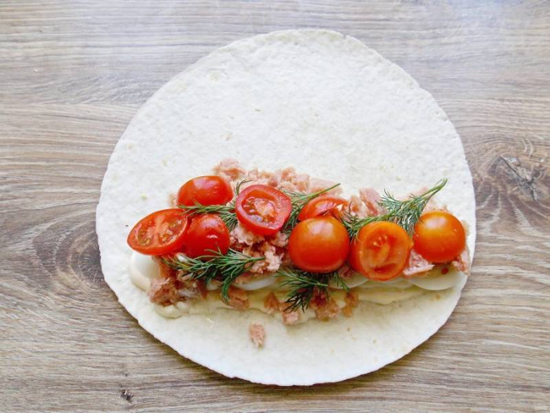 Такая тортилья с консервированным тунцом, яйцами, помидорами и майонезом станет прекрасным завтраком или перекусом. Готовится она очень быстро и сможет выручить, когда к вам придут нежданные гости.