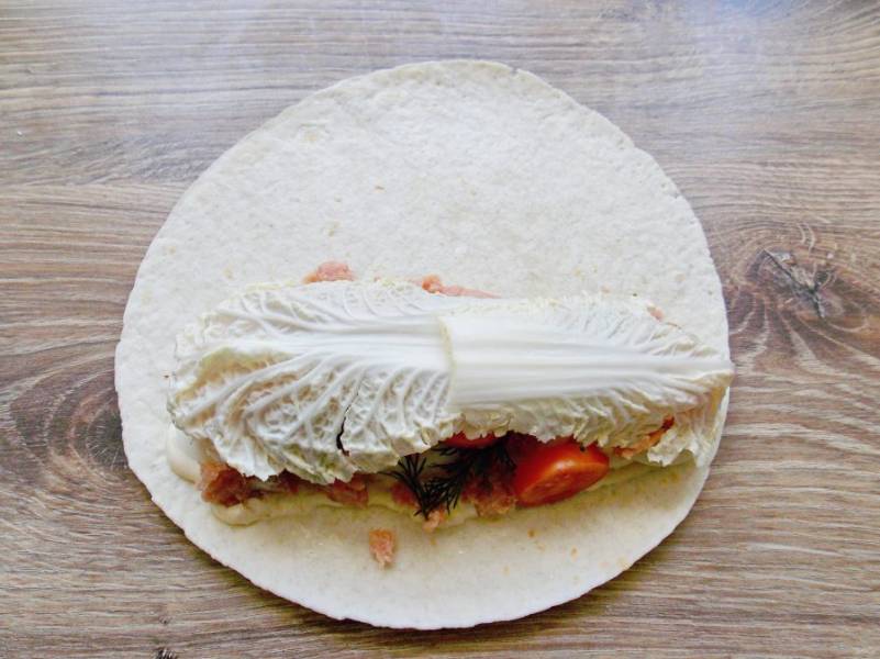 Плотно заверните начинку в лепешку, подвернув один край. Сразу подавайте к столу.