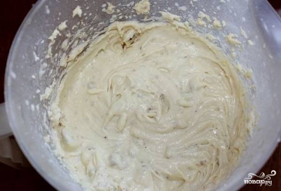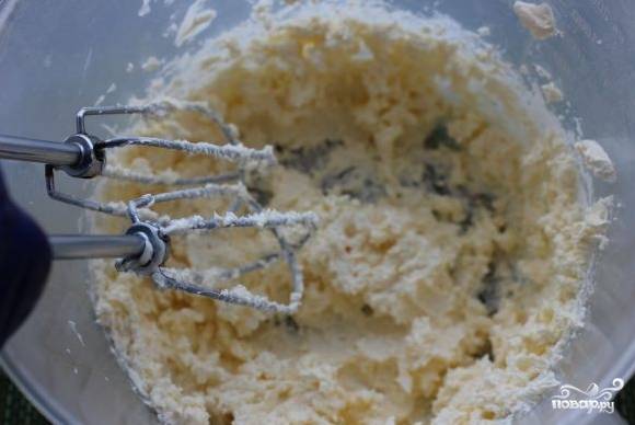 Опустите в глубокую емкость маргарин, ванильный сахар и обычный сахар (90 гр.), взбейте все миксером.