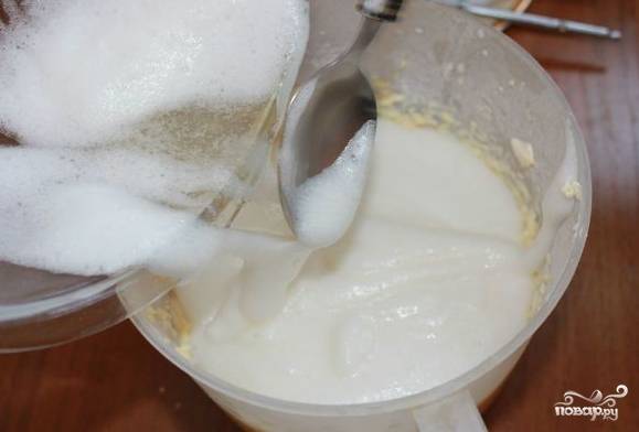 Белки с сахаром смешайте с основной массой без миксера, аккуратно ложечкой.