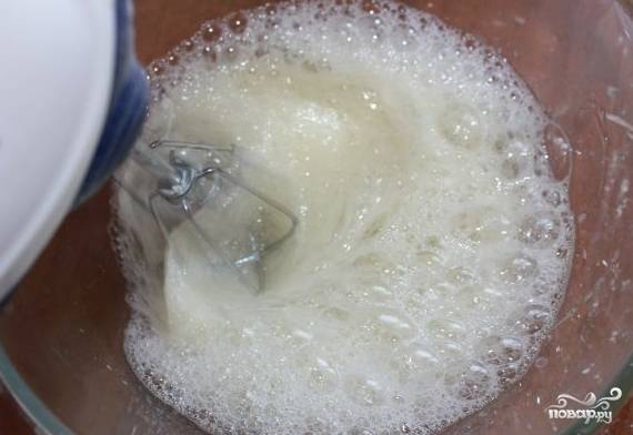 Белки взбейте со щепоткой соли. После того, как они увеличились в размерах, тонкой струйкой всыпьте 90 г. сахара, не переставая взбивать.
