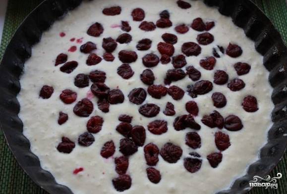 Вылейте тесто в форму для выпекания, сверху аккуратно выложите размороженную вишню.