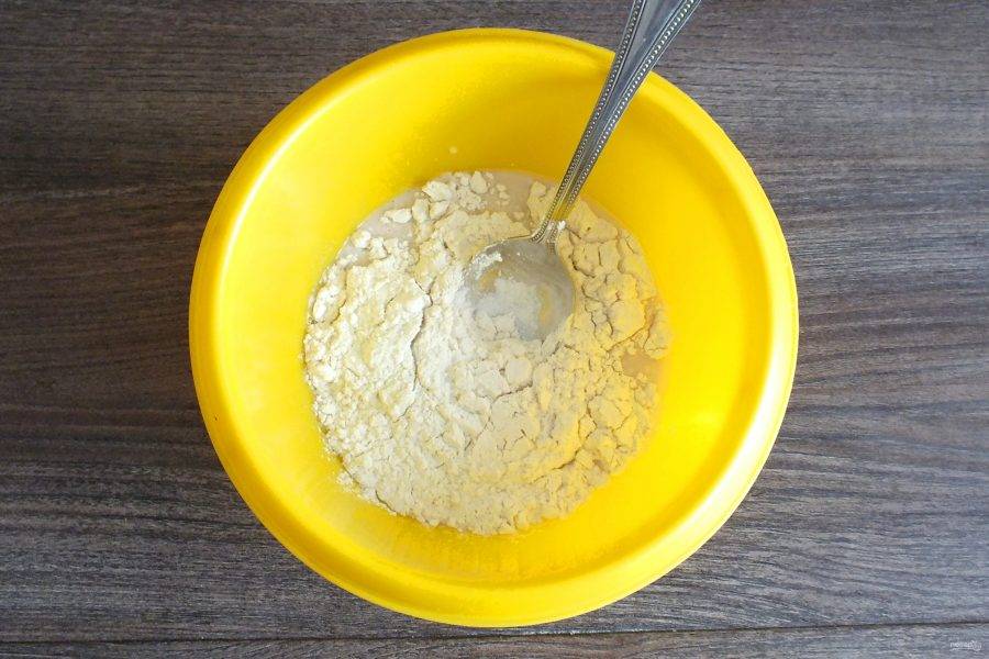 В чаше соедините оставшиеся воду, муку, 100 грамм сахара и пряное масло.