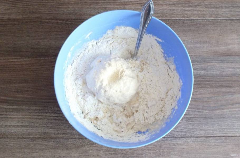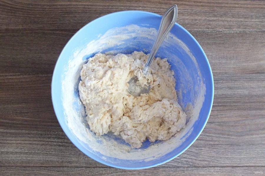 Как только тесто станет однородным, месите руками. Возможно потребуется добавить 2-3 ст.л. муки.