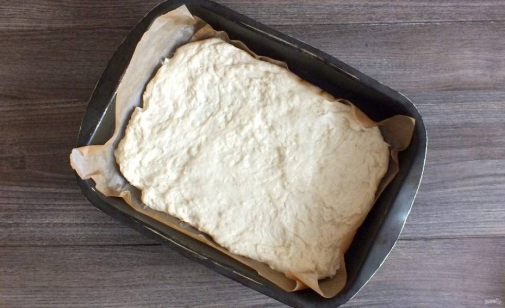 Как только тесто отогреется и заметно подрастет, сделайте обминку. Разделите на две части. Возьмите прямоугольную, просторную форму для запекания. Застелите ее пекарской бумагой. Растяните на ней одну часть теста. Не страшно если местами тесто порвется.