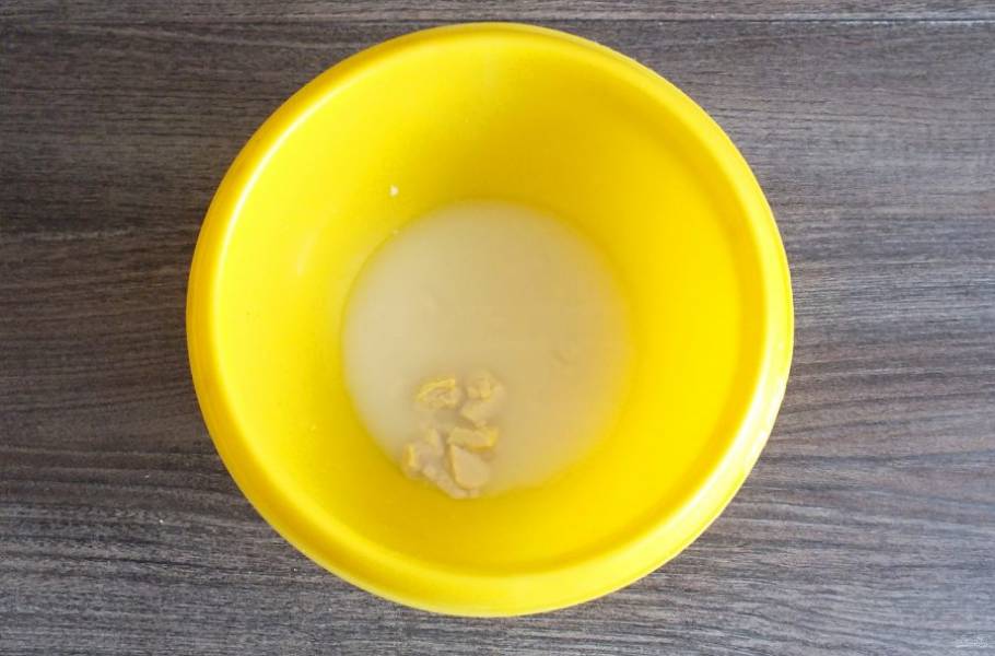 Приготовление теста начните с опары. В чаше смешайте дрожжи и 50 мл. воды.