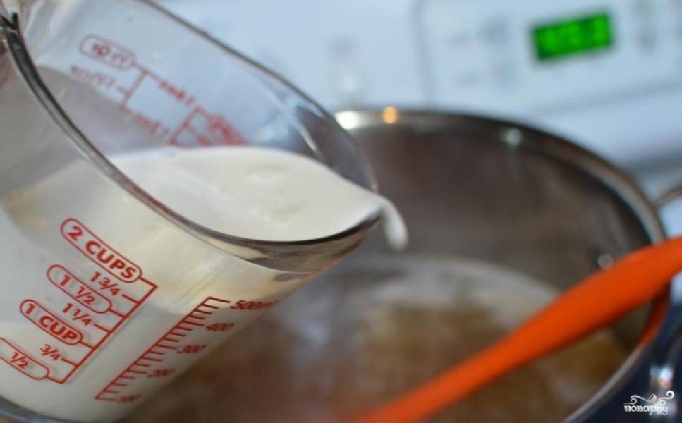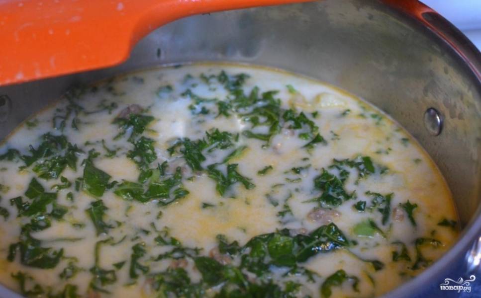 Взбиваем сливки и вливаем их в кастрюлю, доводим до кипения и уменьшаем огонь, кладем мелко нарубленную зелень.