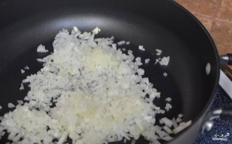 Мелко нарезанный лук и чеснок, пропущенный через пресс обжариваем в масле на сковородке до мягкости и добавляем в кастрюлю в кипящую воду.