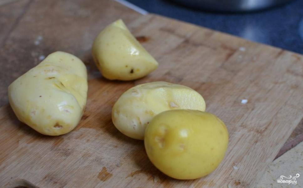 картофель чистим и нарезаем небольшими кубиками опускаем в воду.