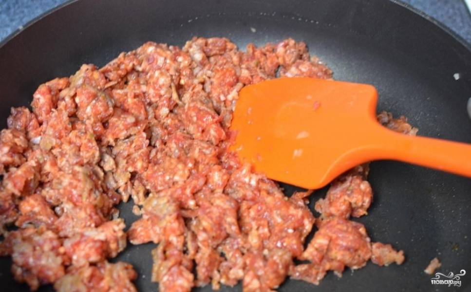 В той же сковородке в большом количестве оливкового масла обжариваем фарш, все время его перемешивая. Не забудьте его посолить и поперчить. Затем кладем его в кастрюлю, уменьшаем огонь.