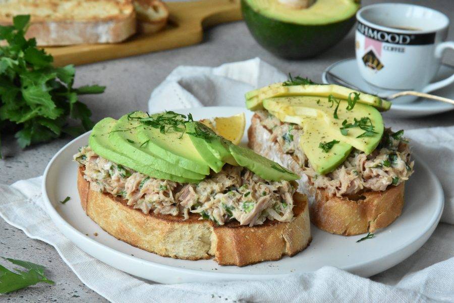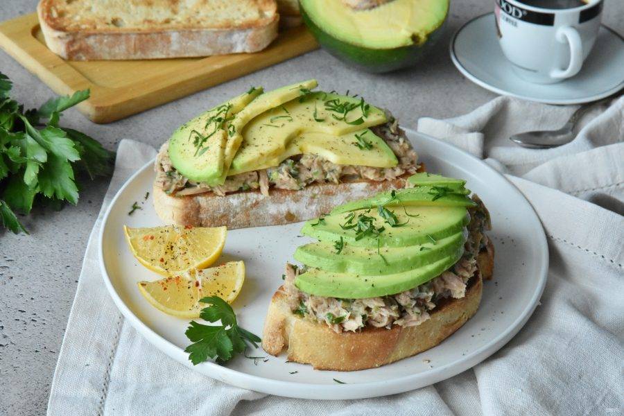 На хлеб выложите щедрую порцию салатной смеси с тунцом. Сверху веером выложите дольки спелого авокадо. По желанию, дополнительно тост можно присыпать кунжутом и щепоткой молотого черного перца.