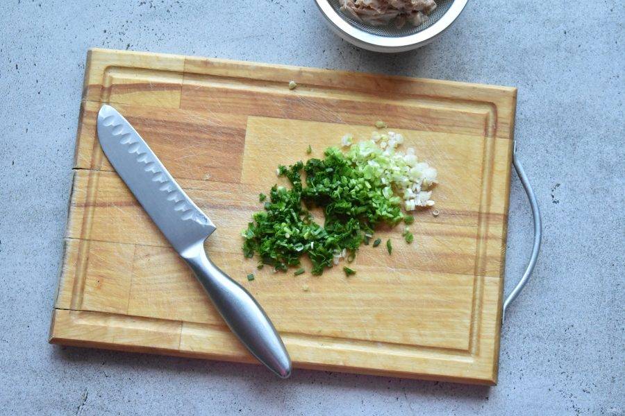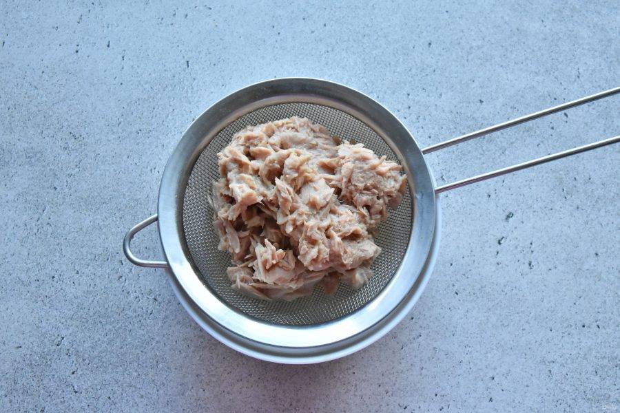Откройте банку с тунцом и откиньте филе на сито, чтобы стекла лишняя влага. Можно использовать готовое рубленое филе или же размять кусочки тунца вилкой.