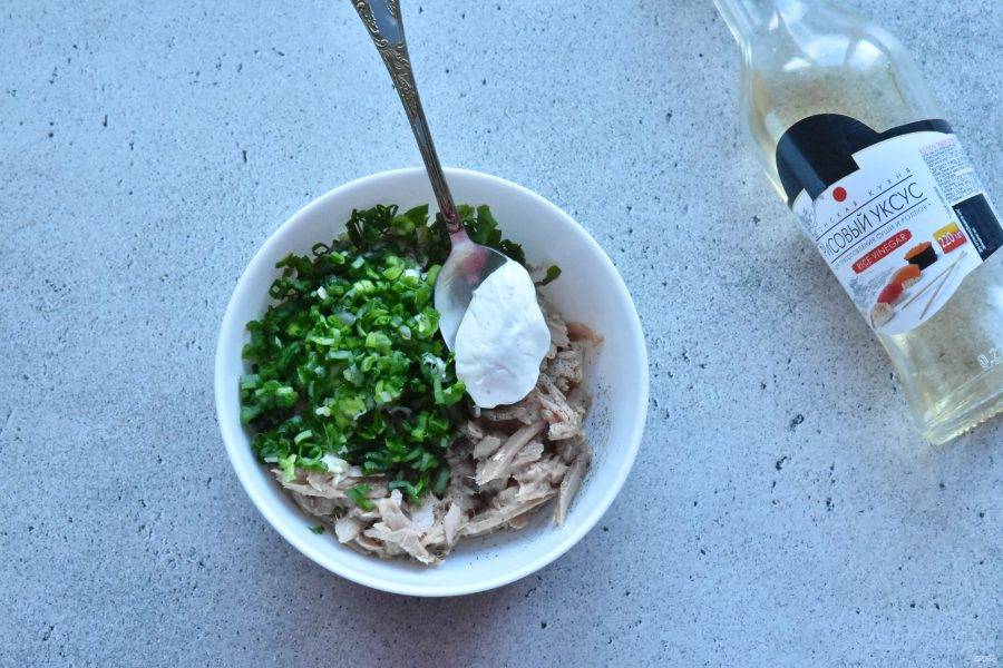 Соедините в миске филе тунца, соевый соус, майонез, кунжутное масло и рисовый уксус. Добавьте измельченный зеленый лук, черный молотый перец и перемешайте.