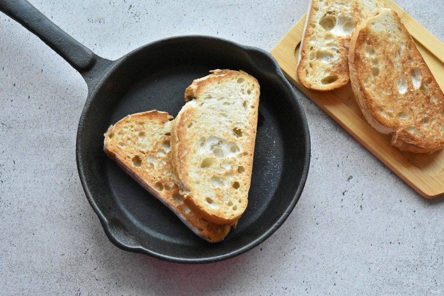 Обжарьте хлеб до подрумянивания с двух сторон на сухой сковороде.