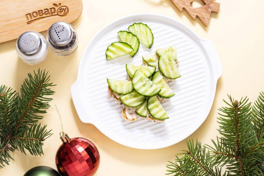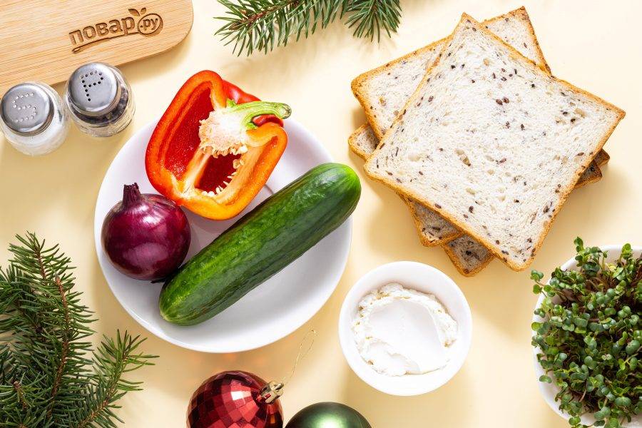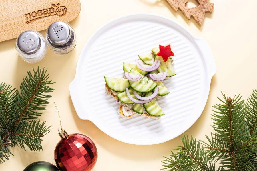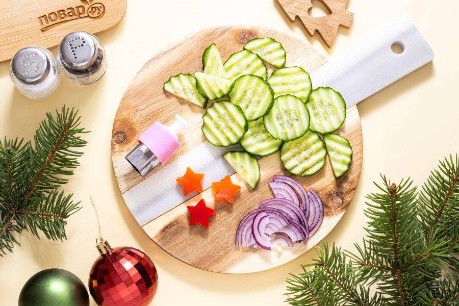 Огурец нарежьте на кружочки, затем разрежьте каждый пополам. Я использую фигурный нож. Красный лук нарежьте тонкими полукольцами, а из болгарского красного перца вырежьте звездочки с помощью формочки для канапе.