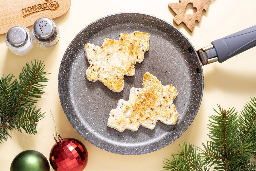 На сухой сковороде обжарьте тосты с двух сторон до румяной корочки.