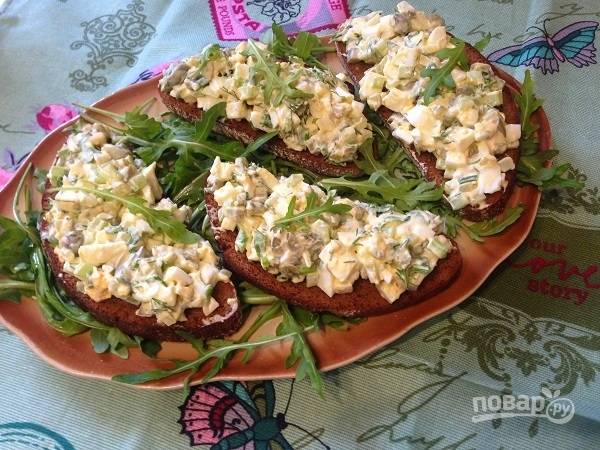 8. Выкладываем тосты с салатом на рукколу и подаем. Вкусно, красиво и необычно :)