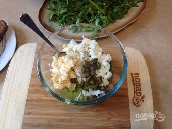 5. Если у вас крупные каперсы, их тоже нарежем помельче. Белок нарезаем кубиками, а желток смешаем с майонезом, так заправка для салата получится ярче.